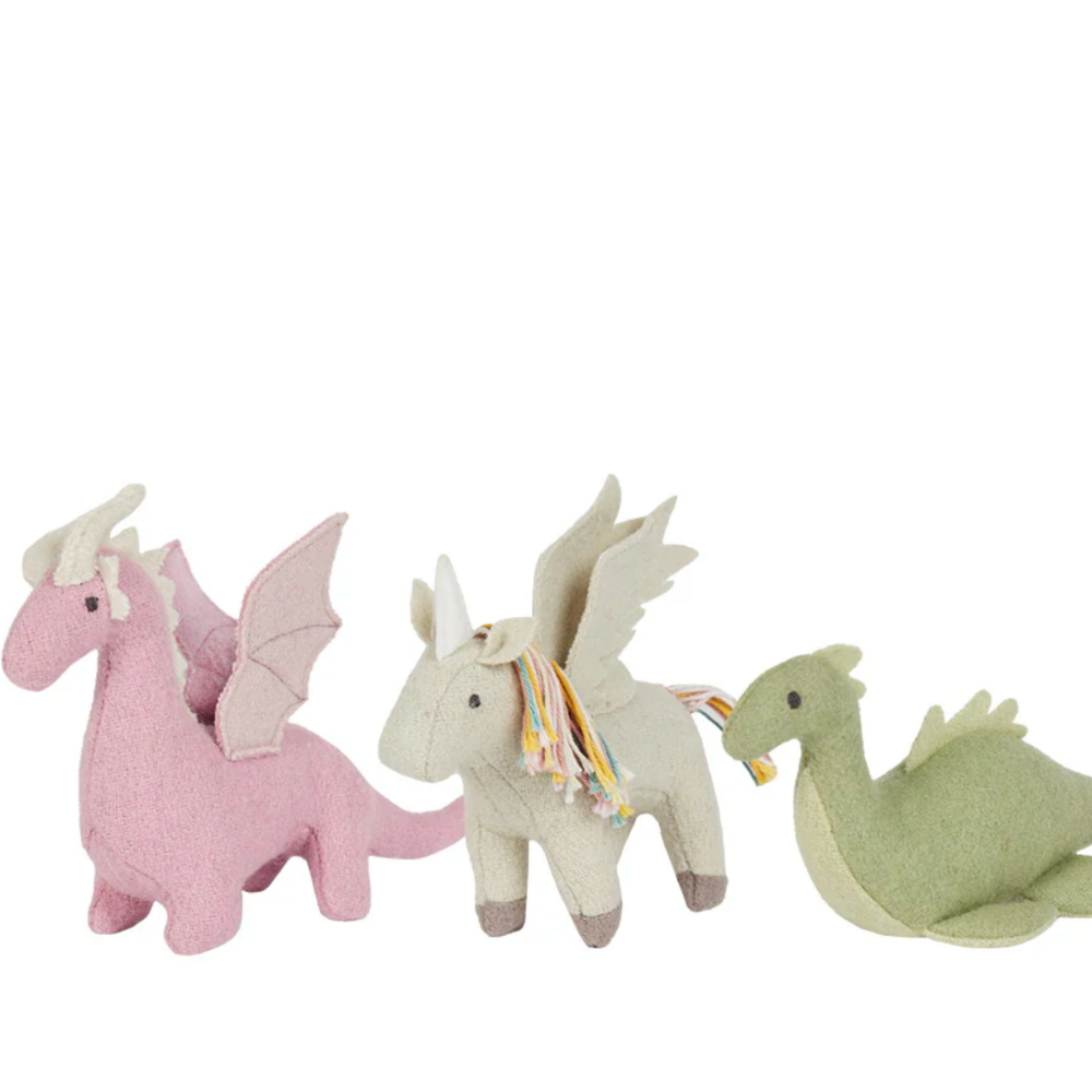 The very beautiful Olli Ella Holdie Magical Creatures live in a special make-believe world of magic, full of wise folk, dreams, and awe. Meet Unicorn, Dragon, and Nessy! Each of the three Creatures are handmade with love from a soft wool blend and have sweet, embroidered features.
