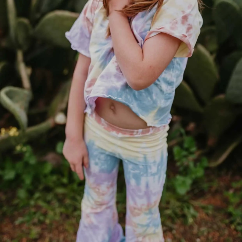 High waisted stretch cotton bell bottoms in pastel rainbow tie dye with sweet lettuce hem details.