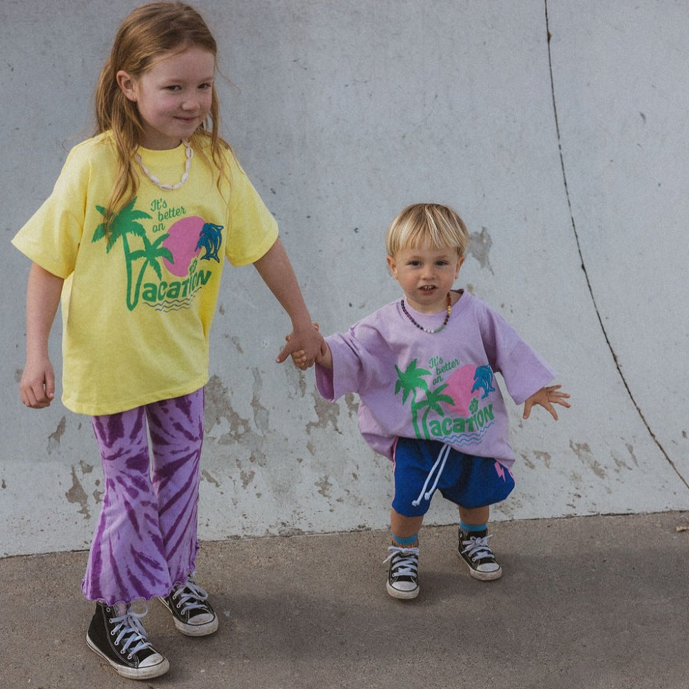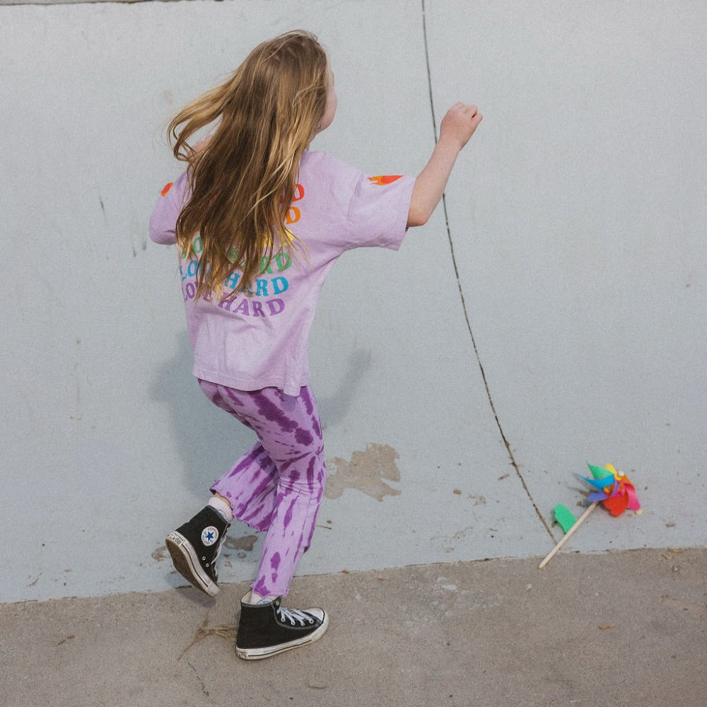 High waisted stretch cotton bell bottoms in purple on purple tie dye with sweet lettuce hem details.