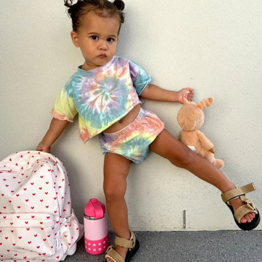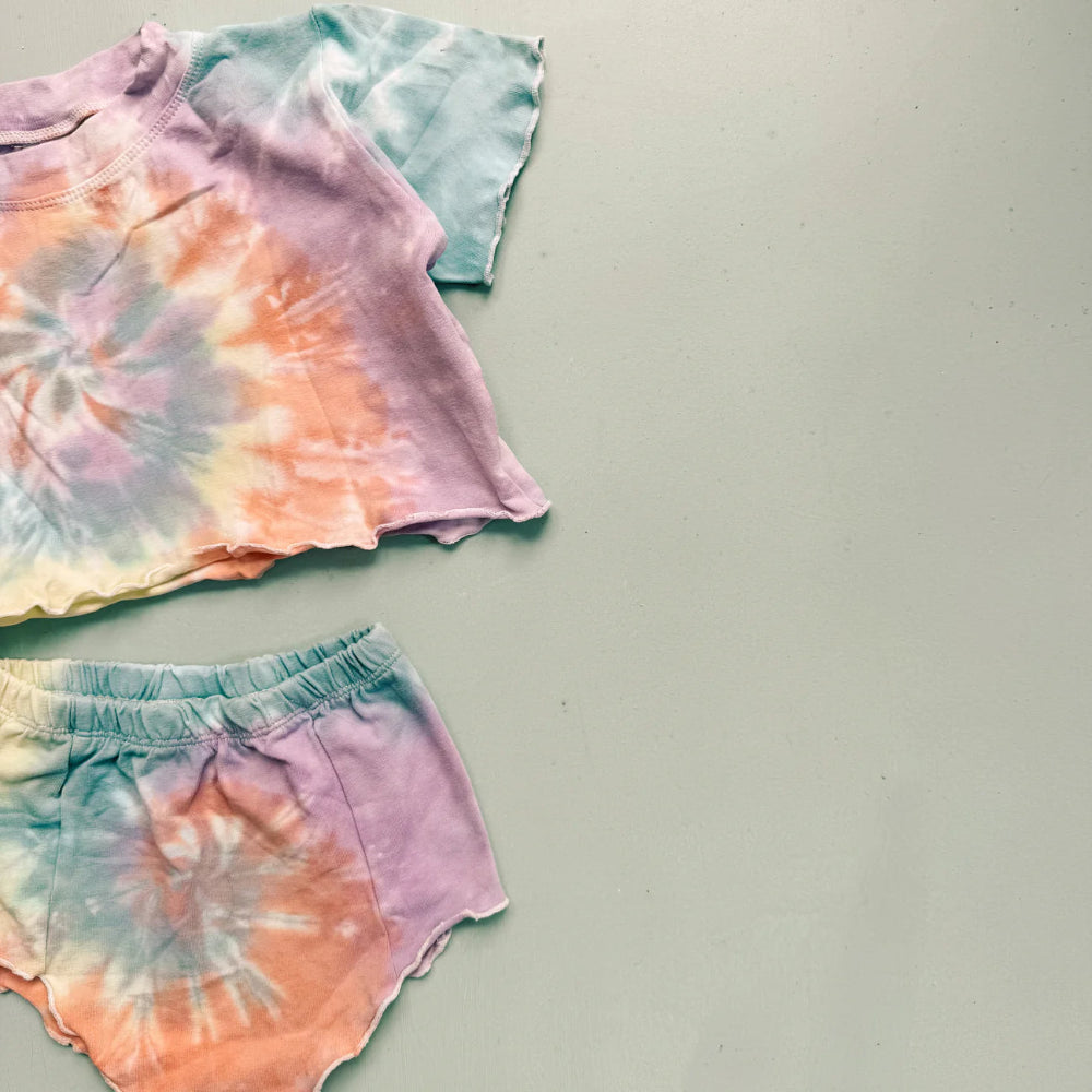 Jaya bloomers in pastel rainbow tie dye. Retro cut bottoms with lettuce hem details. Made from our classic stretch cotton, soft + giving. Could size up if you prefer a roomier fit.