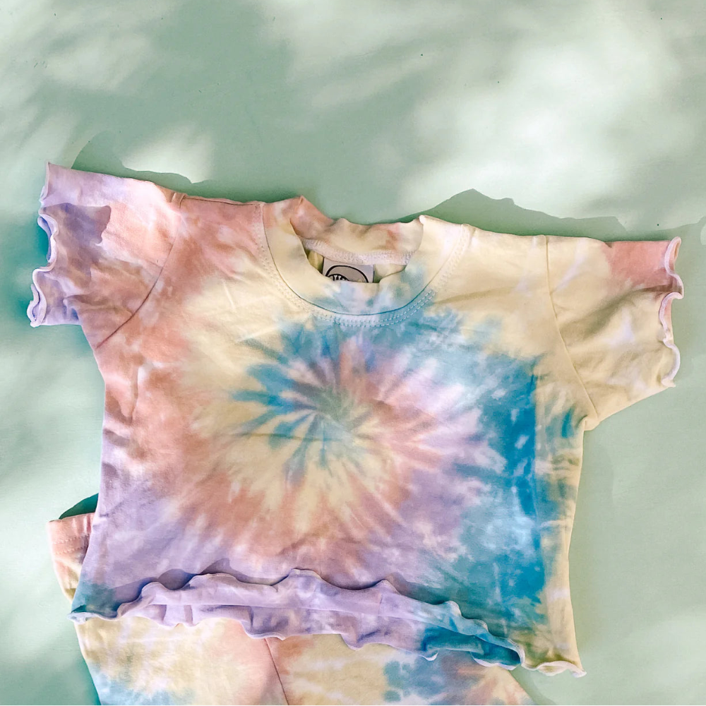 The cutest pastel rainbow tie dye stretch cotton tee...even cuter with our matching Jaya bells or bloomers! Slightly cropped boxy cotton tee with lettuce hem details.