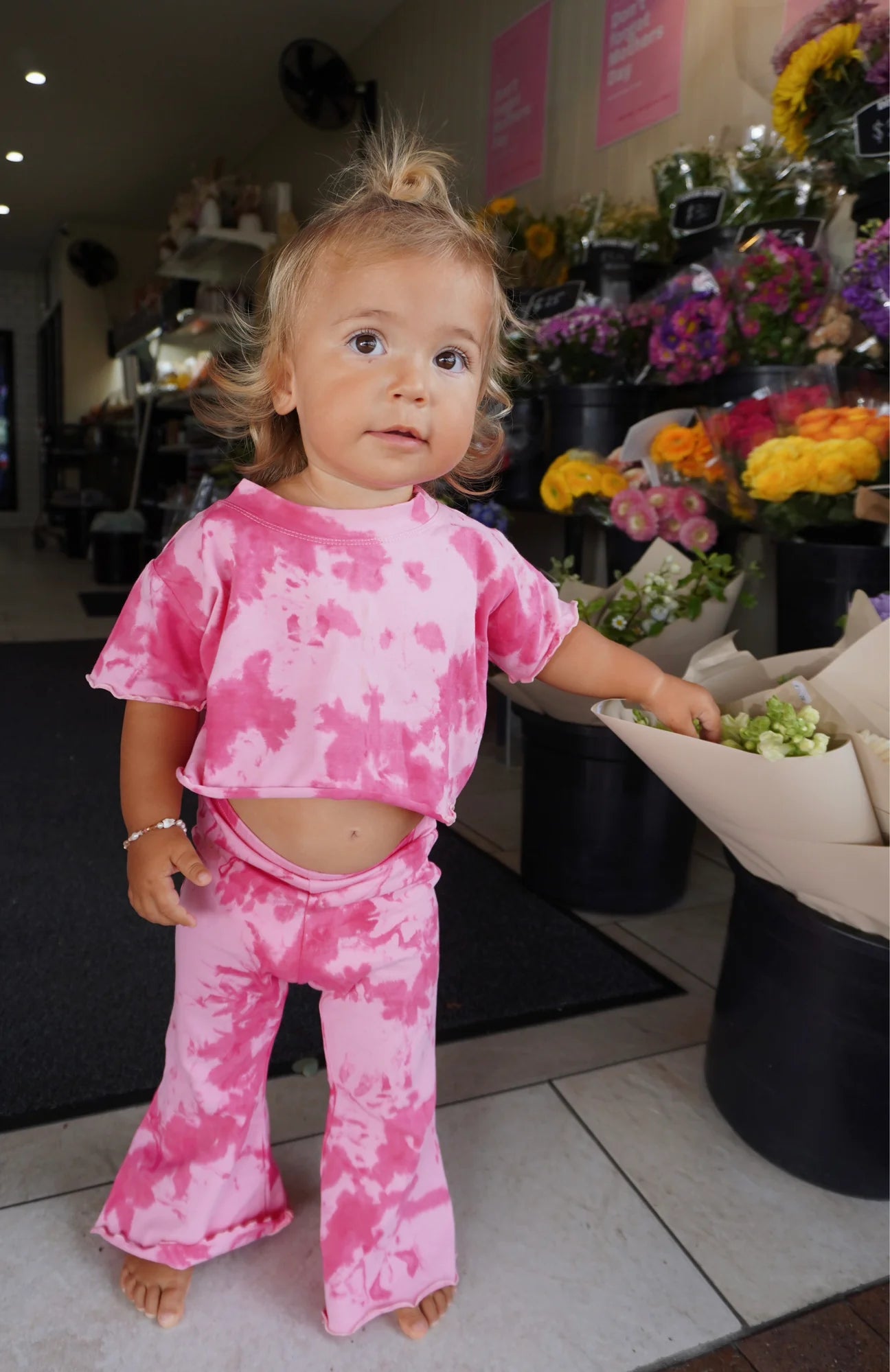 The cutest pink tie dye stretch cotton tee...even cuter with our matching Jaya bells or bloomers! Slightly cropped boxy cotton tee with lettuce hem details.
