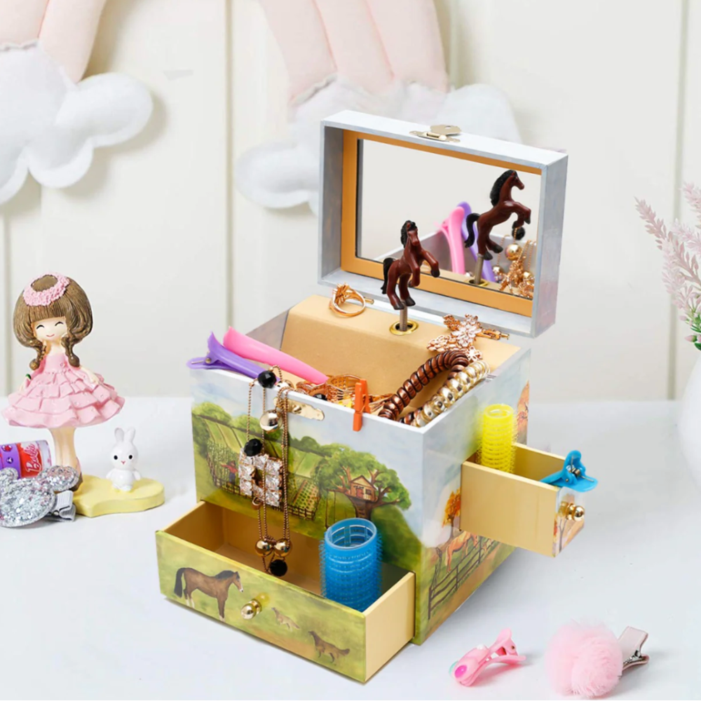 Open the lid of this gorgeous children’s music box by Enchantmints to see a prancing chestnut mare dance to the tune of ‘My Old Kentucky Home’. A magical place to store tiny treasures illustrated with four secret drawers and soft water colour illustrations of horses and other animals on a farm in the country. This music box will be cherished for many years.